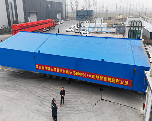 造船门式起重机是船舶制造领域的核心吊装设备,专用于船体分段吊装、翻身及合拢作业。其采用双梁门式框架结构,主梁跨度通常覆盖40-130米,最大跨度可达200米以上,可横跨整个船坞或船台作业。设备配备双小车四吊钩系统:上小车设双主钩,下小车设单主钩与副钩,两车可交叉运行并实现下小车穿越上小车作业,支持单吊、抬吊、三钩抬吊及空中180度翻身等复杂操作。